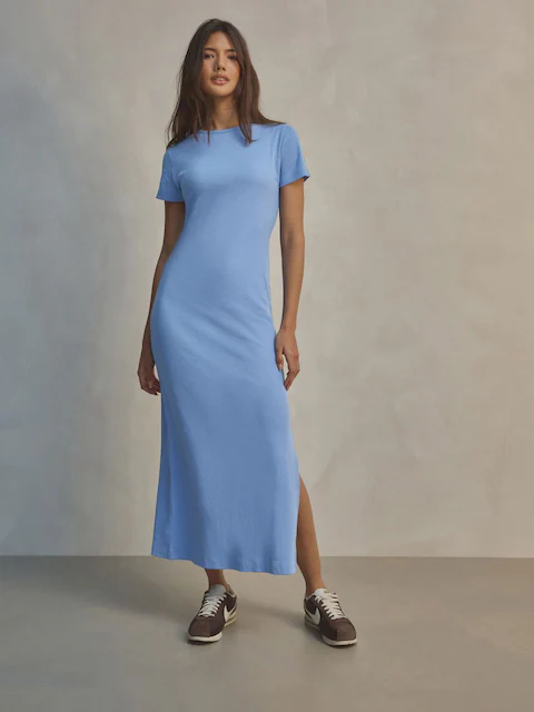 Sky Blue Ribbed T-Shirt Style Column Maxi Dress With Slit Detail