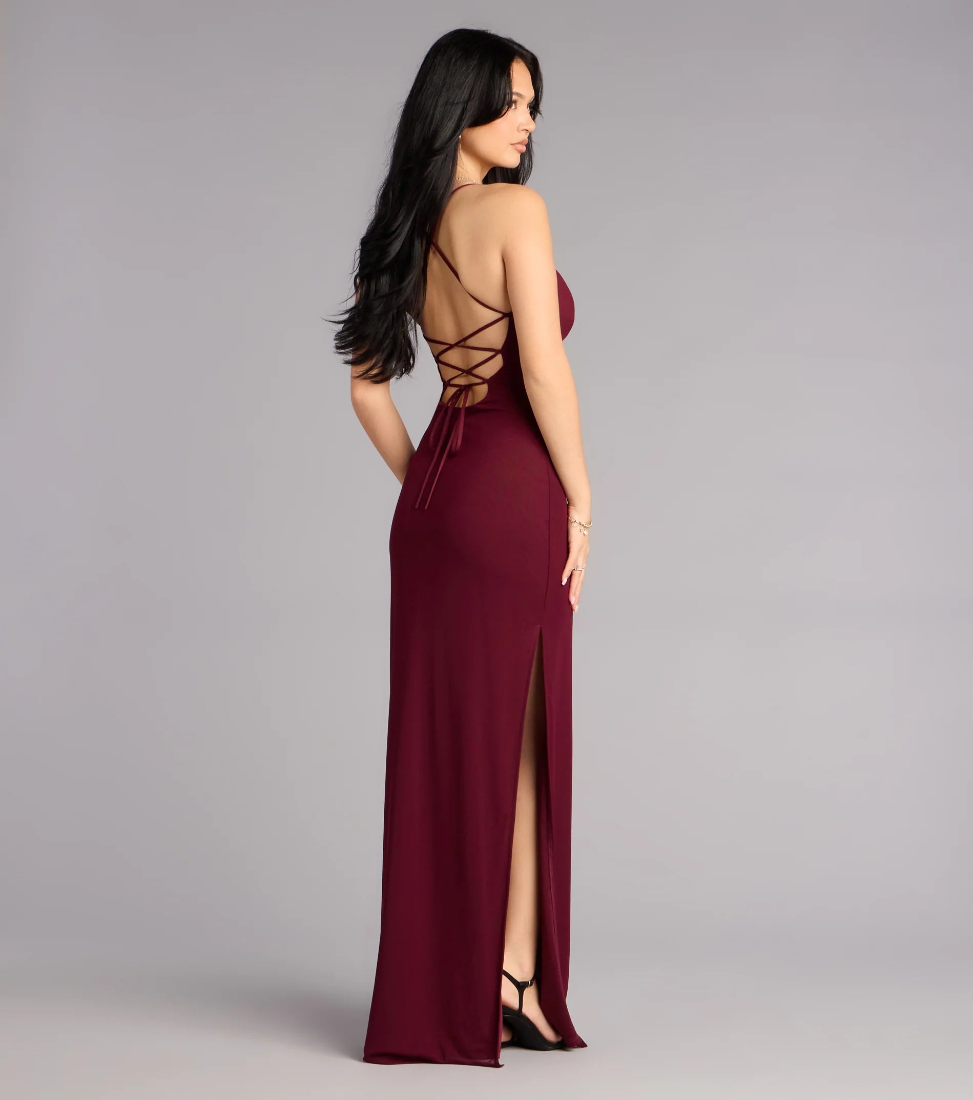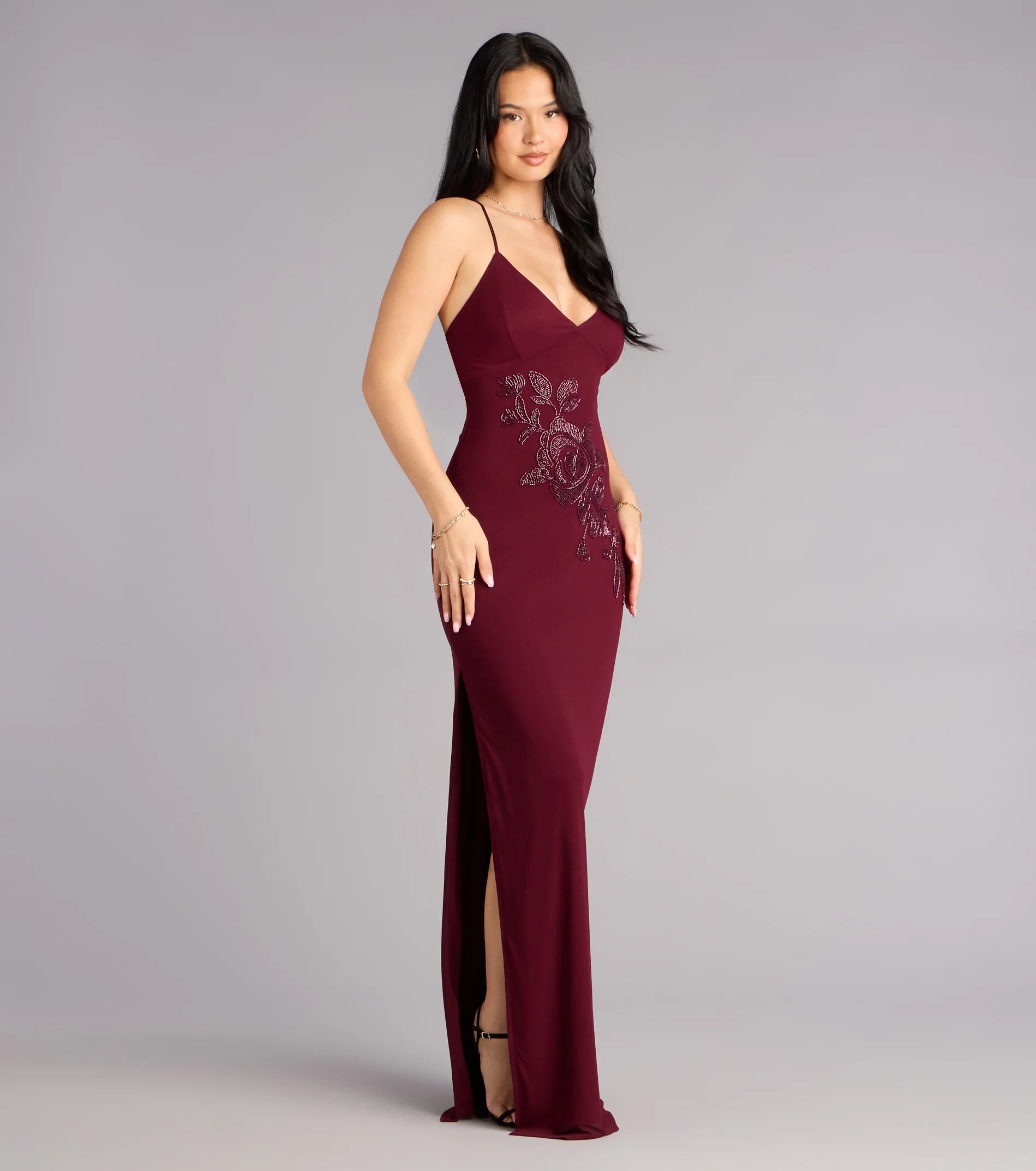 A gown made to captivate, the Adriane floor-length dress boasts delicate straps, a plunging neckline, and sculpted beaded floral embroidery that draws the eye. Finished with a lace-up open back, it’s the perfect balance of allure and elegance.