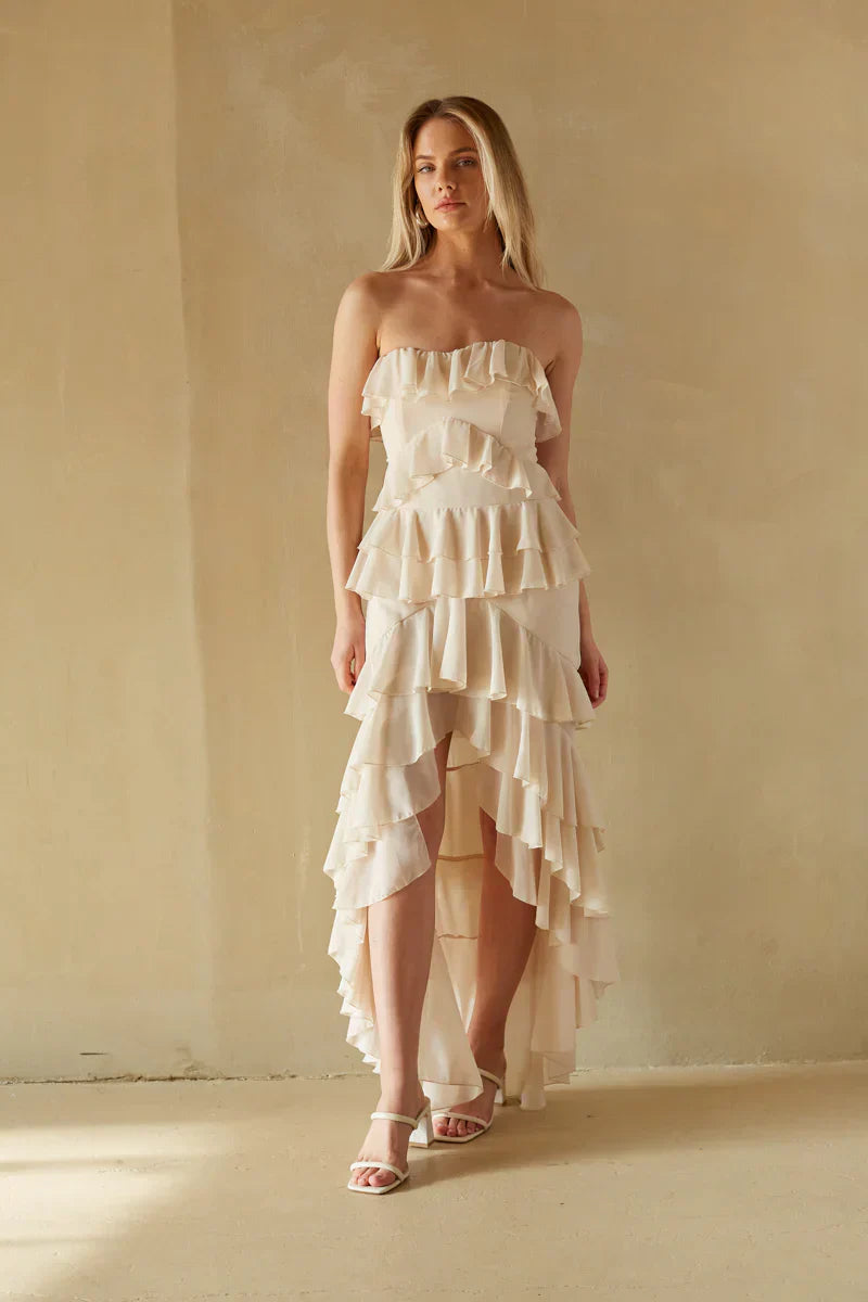another style within 30 days of receiving your order.They'll be falling in love when they see you in the Clementine Strapless High Low Ruffle Maxi Dress! This elegant dress features a strapless sweetheart neckline, boning in the bust for structure, a ruffle trim, tiered ruffles throughout, and a high-low hem. Finish off the look with some simple !