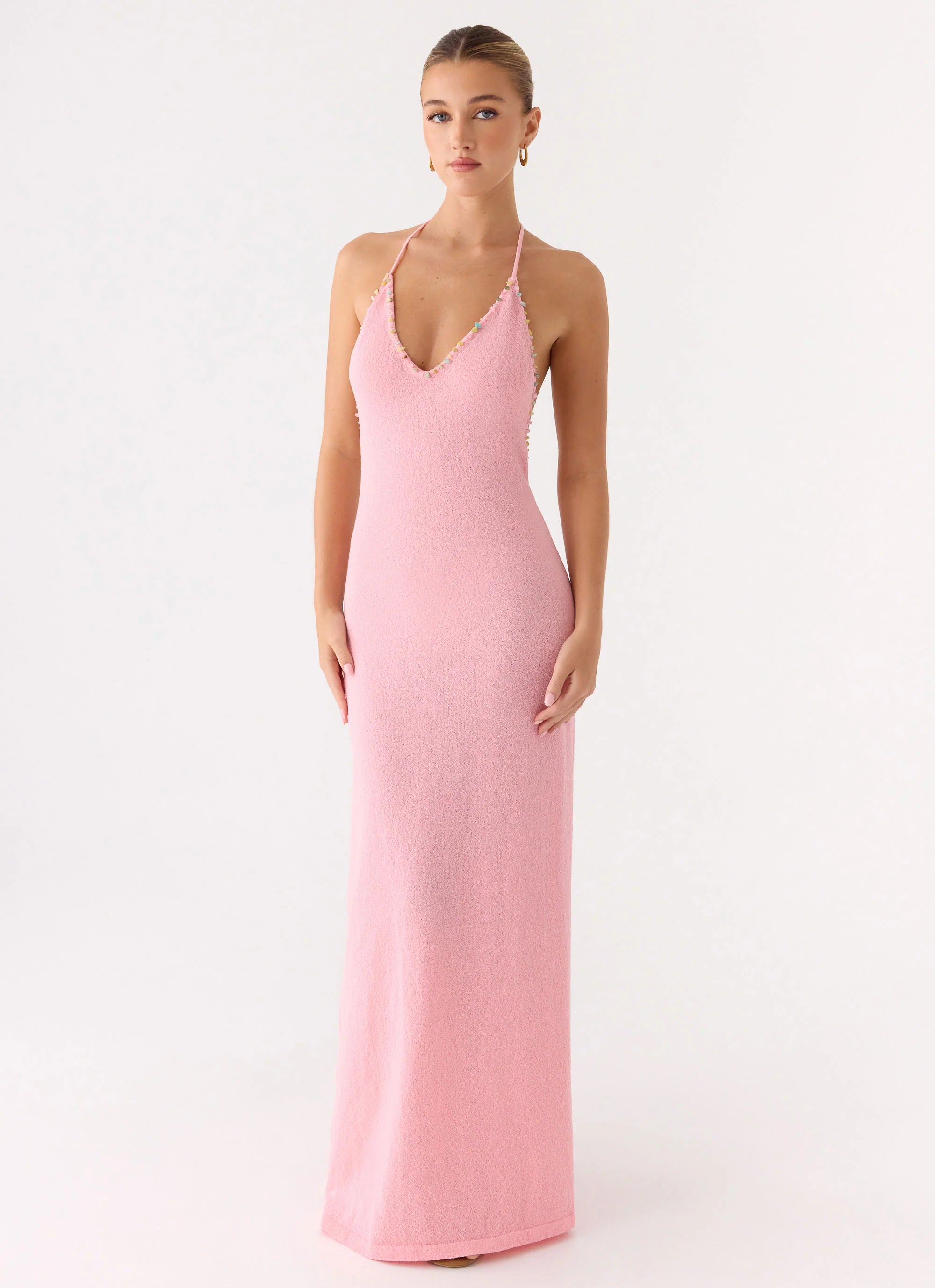 The Jianna Knit Maxi Dress is made for sun-soaked afternoons and nights that linger into golden hour. Featuring a flattering V-neckline, low back, and intricate back detailing with trims, this maxi silhouette slips on effortlessly for a relaxed yet elegant fit. Unlined for lightweight comfort, it moves gracefully with every step.
