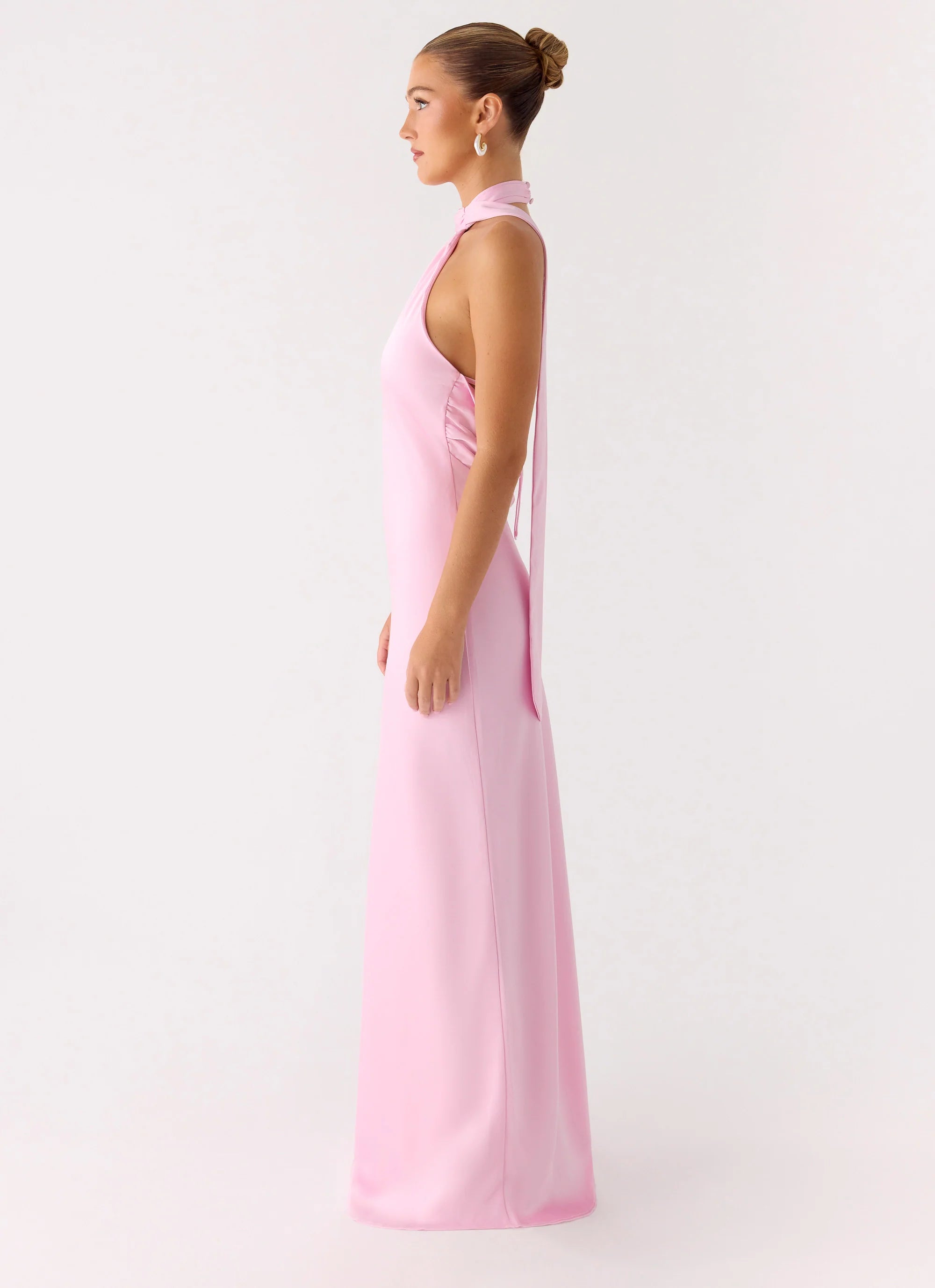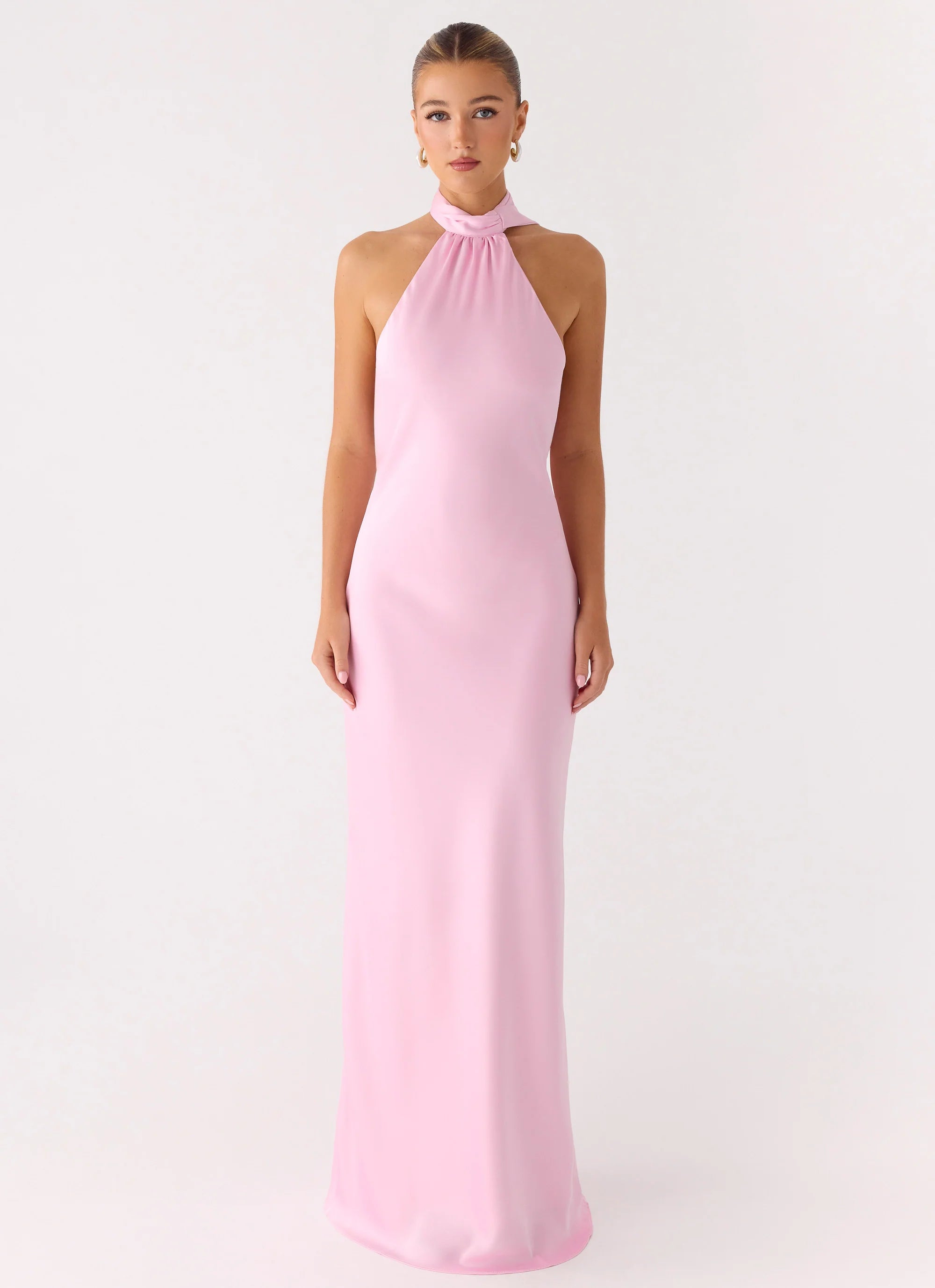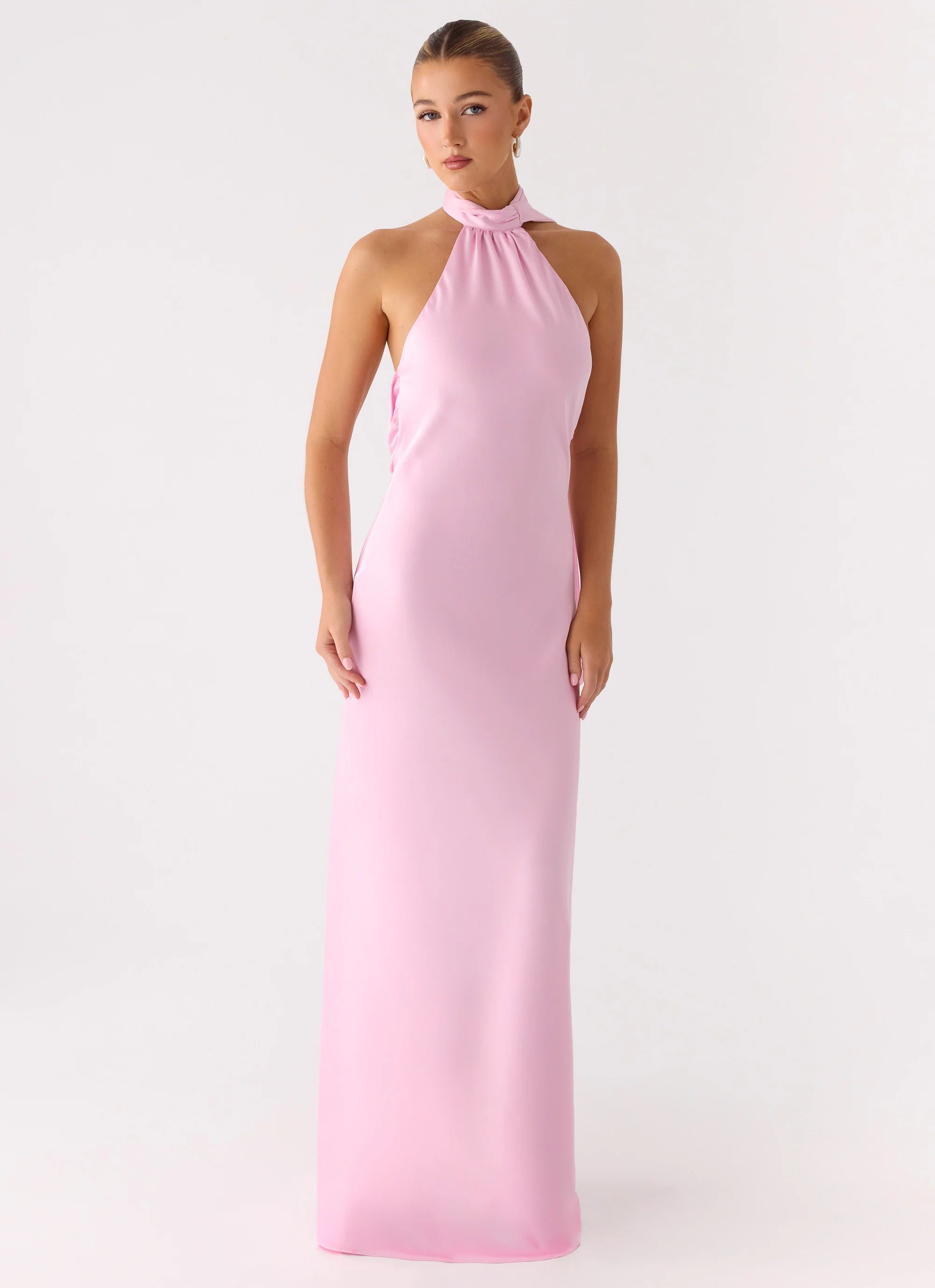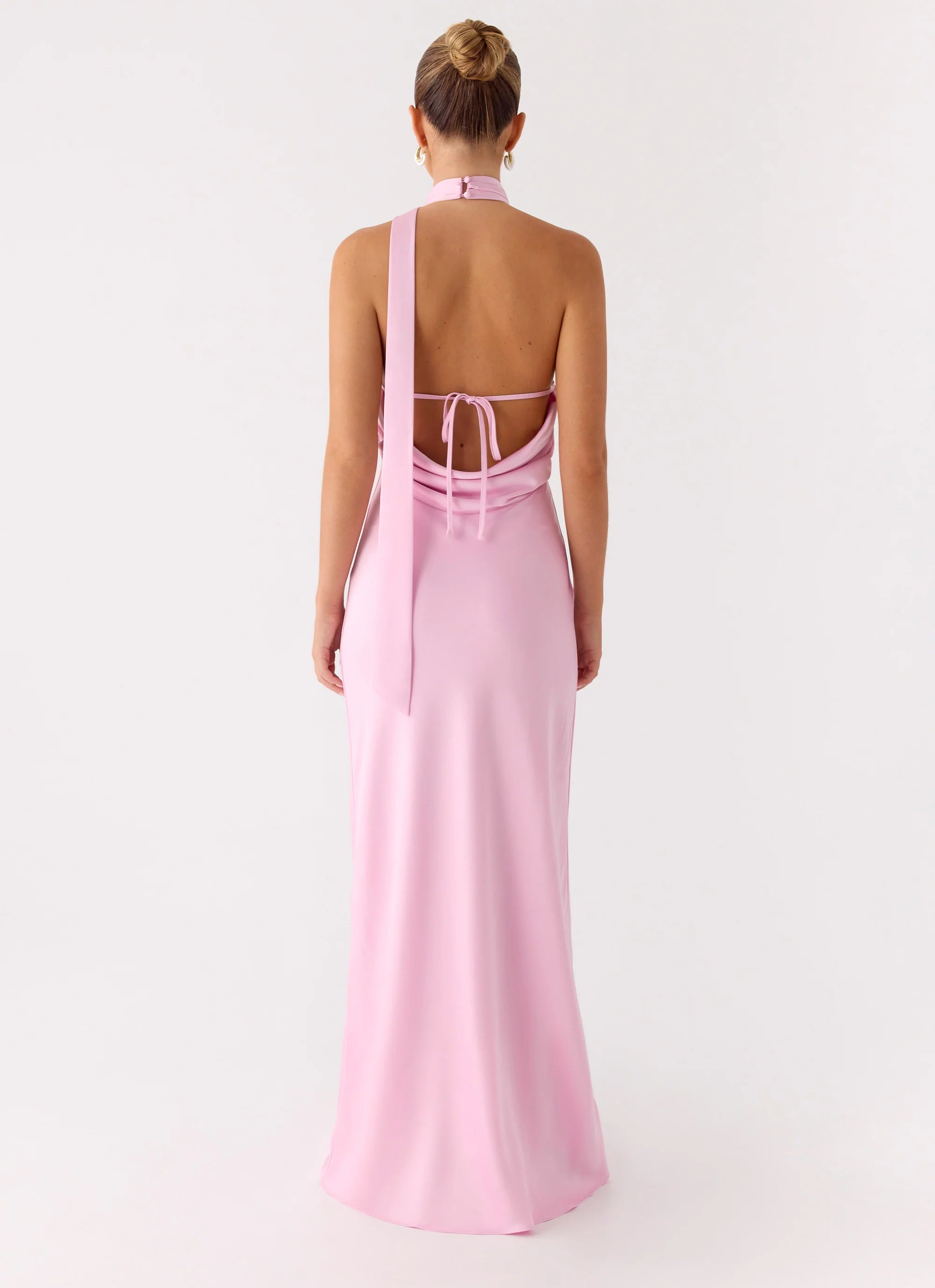 The Keena Scarf Maxi Dress is made for effortless elegance. Featuring a sophisticated halter neckline with long, thin straps and a sultry low cowl back, this bias-cut maxi drapes beautifully into a fluid silhouette. Crafted from a luxurious satin fabric.