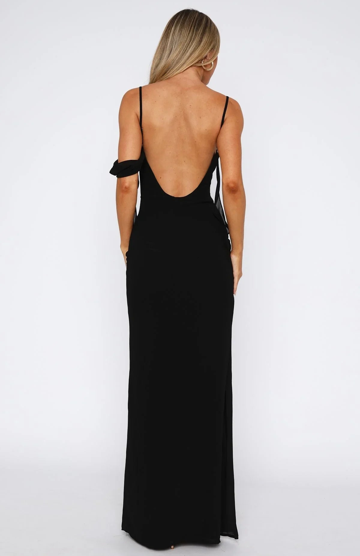 another style within 30 days of receiving your order.Love is in the air with the Love Blossoms Maxi Dress Black! Featuring thin, adjustable shoulder straps, a cowl neckline, side strap detailing, backless, maxi length with side leg split, lined, and invisible side zipper and clasp closure. Style with high shine accessories and a kitten heel for a night you won't forget!