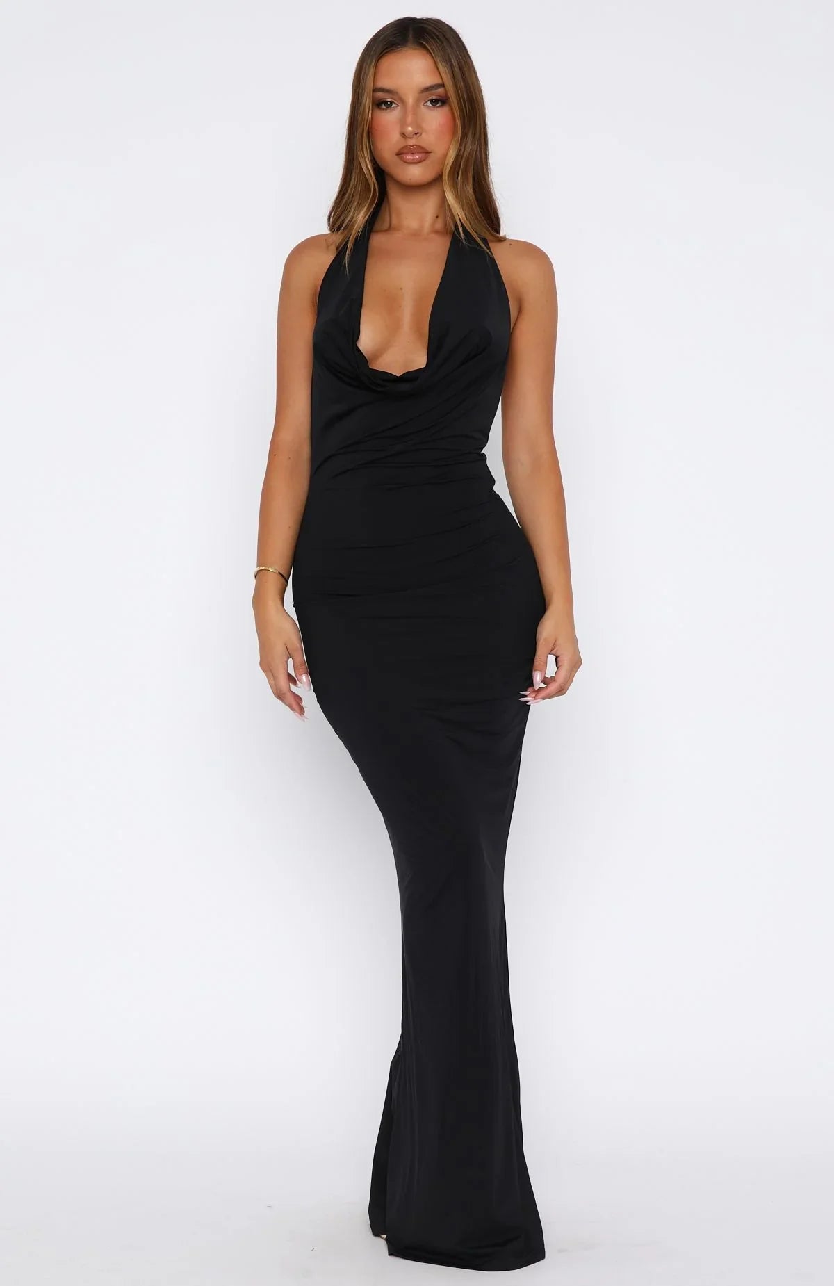 another style within 30 days of receiving your order.She's Euro Summer ready in the Vacation Time Maxi Dress Black. Features a plunge neckline, halter neck style straps with back tie-up straps, sheer lining, backless, plunge neckline, maxi length and gorgeous printed fabric! Stand out at your next event and pair it with a mini bag and show off your look!