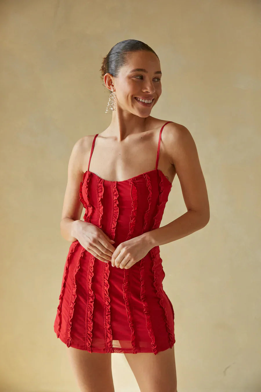 another style within 30 days of receiving your order.Get ready for your next date night in the Venetia Ruffle Slip Mini Dress! This sexy dress features an A-line silhouette, soft sweetheart neckline, adjustable spaghetti straps, and vertical ruffle trimmed stripes. Pair with a sleek to finish off the look!