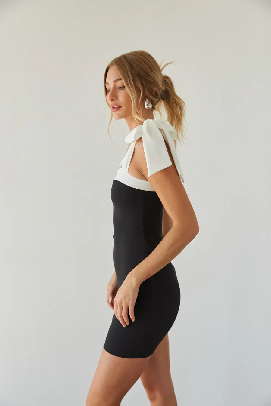 another style within 30 days of receiving your order.Timeless and classy, the Viola Contrast Bow Strap Mini Dress is Old Money embodied! This little black dress features a white contrast neckline and straps, tie bow detail, and flattering bodycon silhouette. Pair this mini dress with a chic pair of to complete the look!